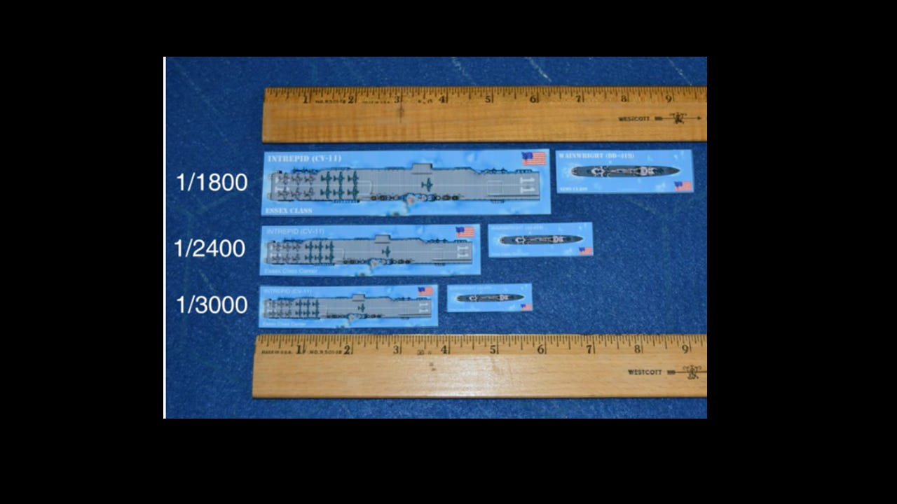 Scale is an interesting word with regards to miniature gaming. Most gamers will immediately associate that word with the physical size of the miniatures, so I’ll start there. Going off the categories started earlier, I’ll start with the standard scales for historical gaming. Traditionally, historical games have been played in 1/600, 1/1200, 1/2400, 1/3000, and 1/6000 scales. In general, the larger scales, such as 1/600, have been used for age of sail and ancient games, since the ships were physically smaller during those eras and engagement rangers were shorter. By the time we get to WWII and Modern, larger ships and longer engagement ranges make the smaller scales more popular. Of note is 1/1800 scale, which is a relative new-comer to the naval gaming hobby. This scale was essentially created by the Axis & Allies Naval Miniatures game, which launched in 2008. The popularity of this scale has grown in recent years, with the recent re-launch of Victory at Sea from Warlord Games adopting this scale as well.