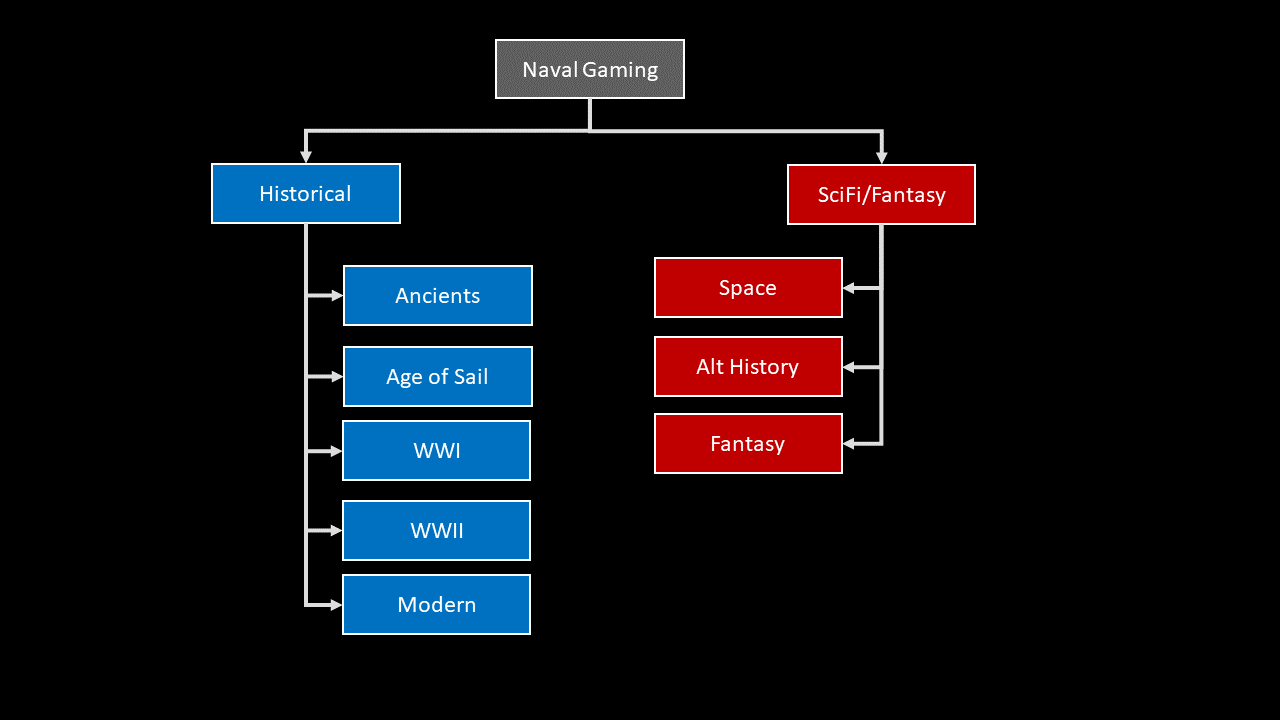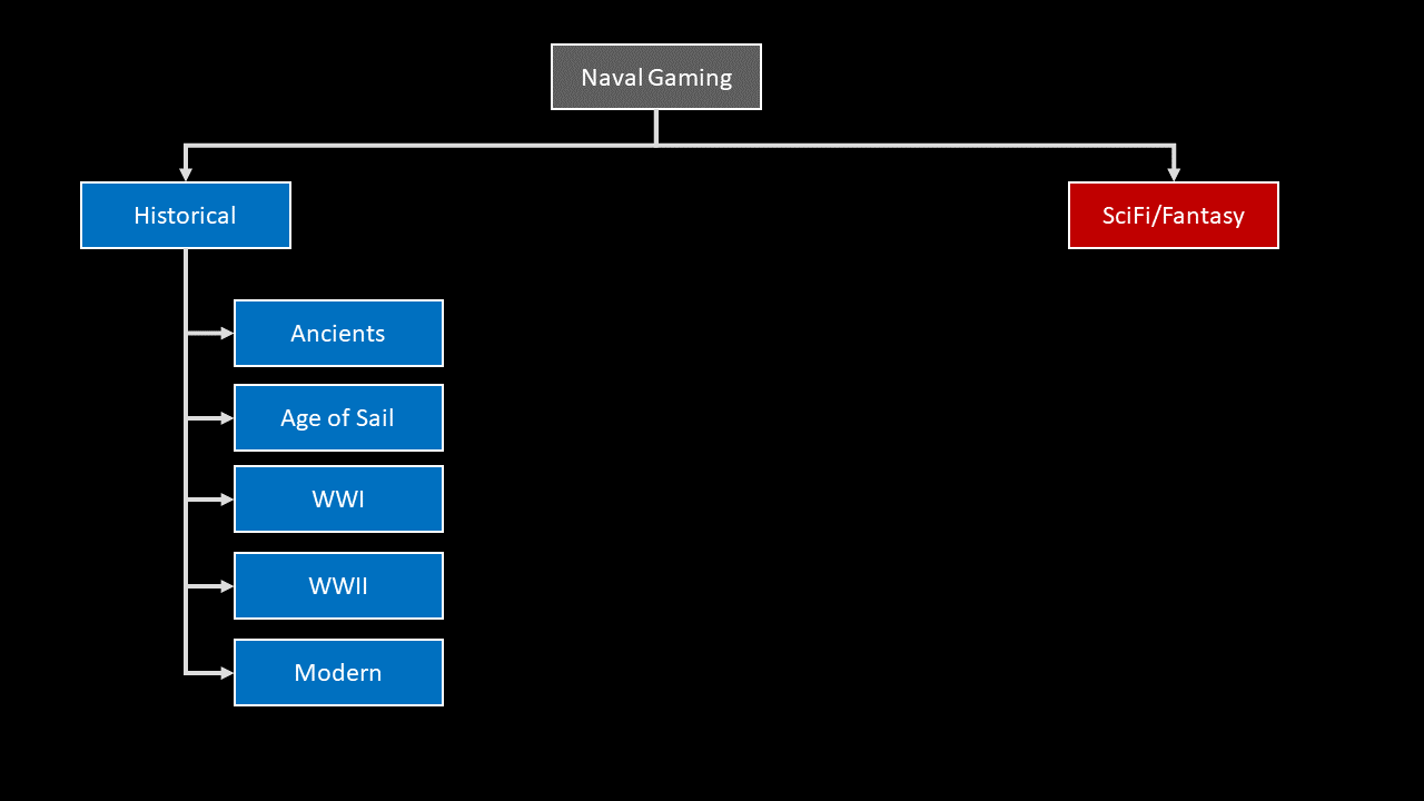 The first major split is between what I call “Historical” games - those based on real historical conflicts and using historical ships, and “Sci-Fi/Fantasy” games, which are based in settings that are either partly or entirely made up. On the historical side, the major time periods for naval gaming include Ancients (think galleys and triremes), Age of Sail, WWI, WWII, and “Modern” which includes anything from post WWII to the present day. From my experience, WWII is by far the most popular era, followed by Age of Sail. WWI and Modern seem to be about tied in popularity, while ancients are very much a rarity.